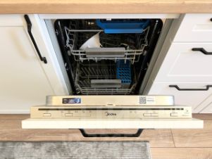 Кухонный гарнитур оснащен посудомоечной машиной, варочной поверхностью, вытяжкой, и духовым шкафом.