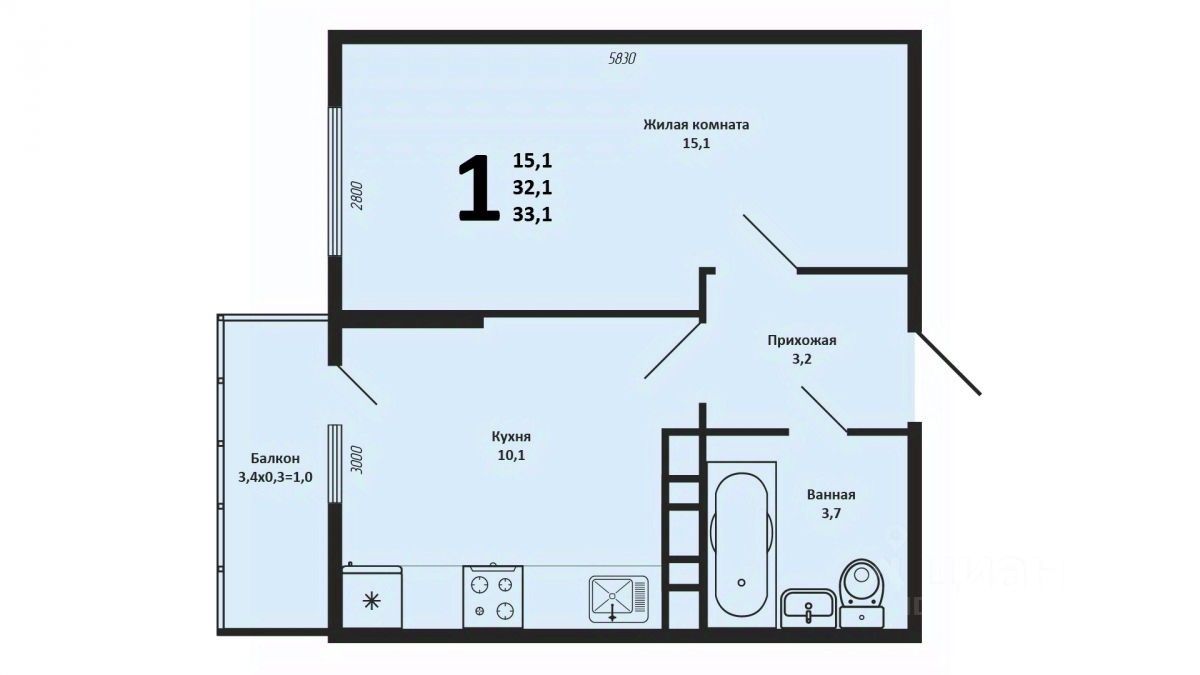 - Кухня: 10,3 м²
