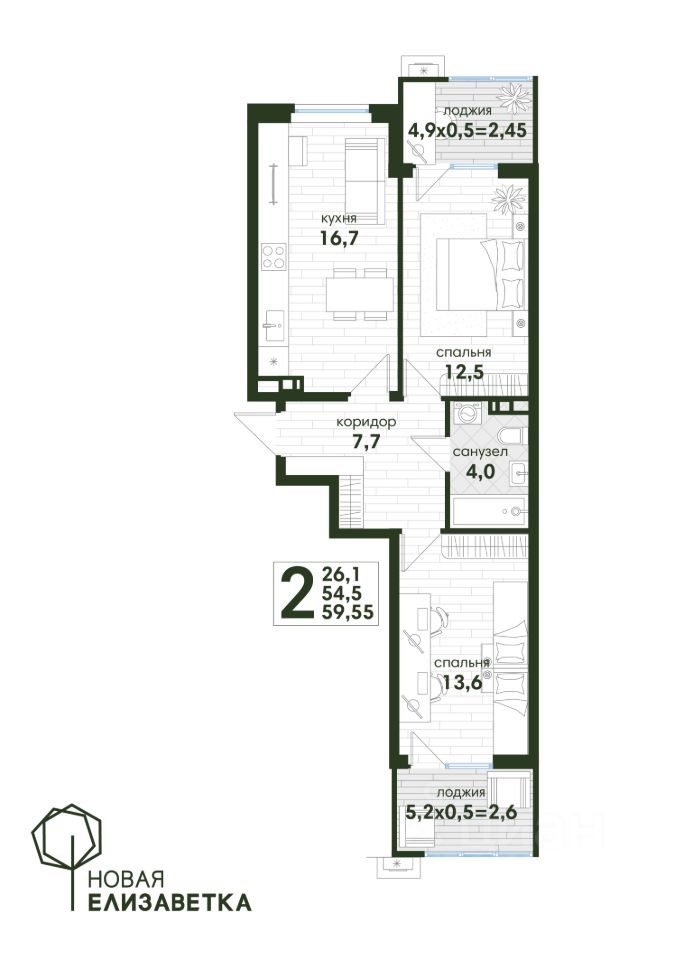 Продаётся 2-комнатная квартира в сданном доме (Дом 3.1 литер 6), срок сдачи: IV-кв. 2024, общей площадью 59.55 кв.м., на 3 этаже. Уникальный зелёный оазис тишины и спокойствия "Новая Елизаветка" в пригороде Краснодара.