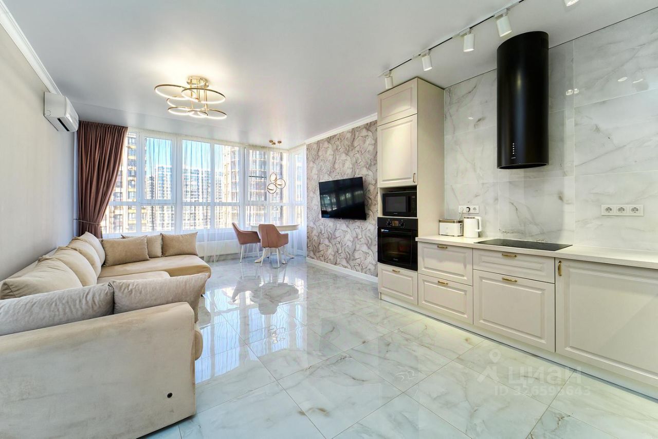 Общая площадь квартиры с учётом лоджий составляет 78 квадратных метров. Планировка квартиры с огромной кухней-гостиной площадью 29 квадратных метра, с витражным окнами, очень светлая и продуманная до мелочей. Установлены датчики протечки воды во всех мокрых точках.