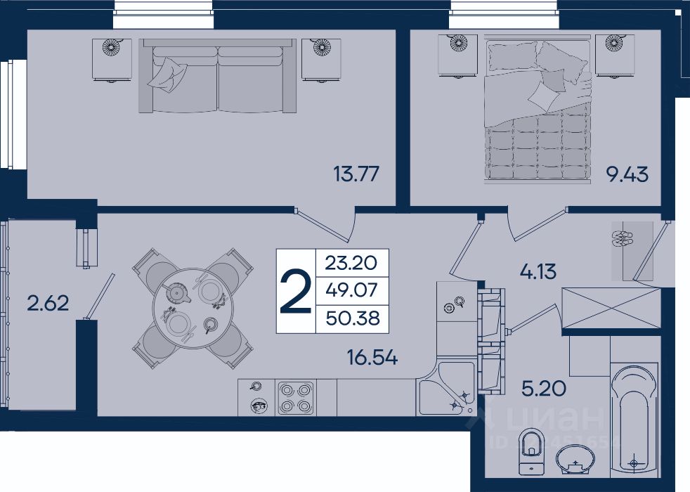 2 комнатная квартира 50.38 м² с ремонтом, на 5 этаже в жилом комплексе "Дом 101".