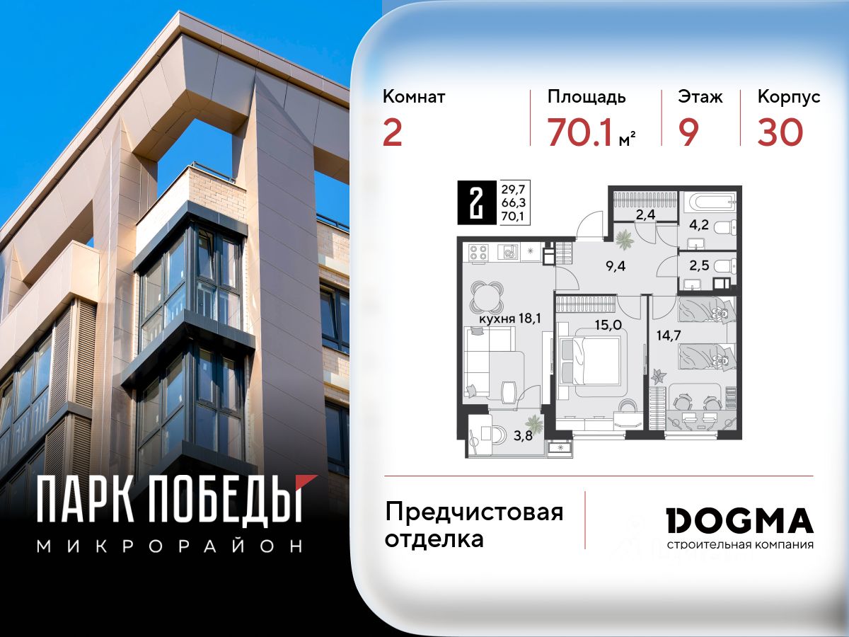 Срок сдачи: 4 кв. 2025, общей площадью 70.1 кв.м., на 9 этаже.