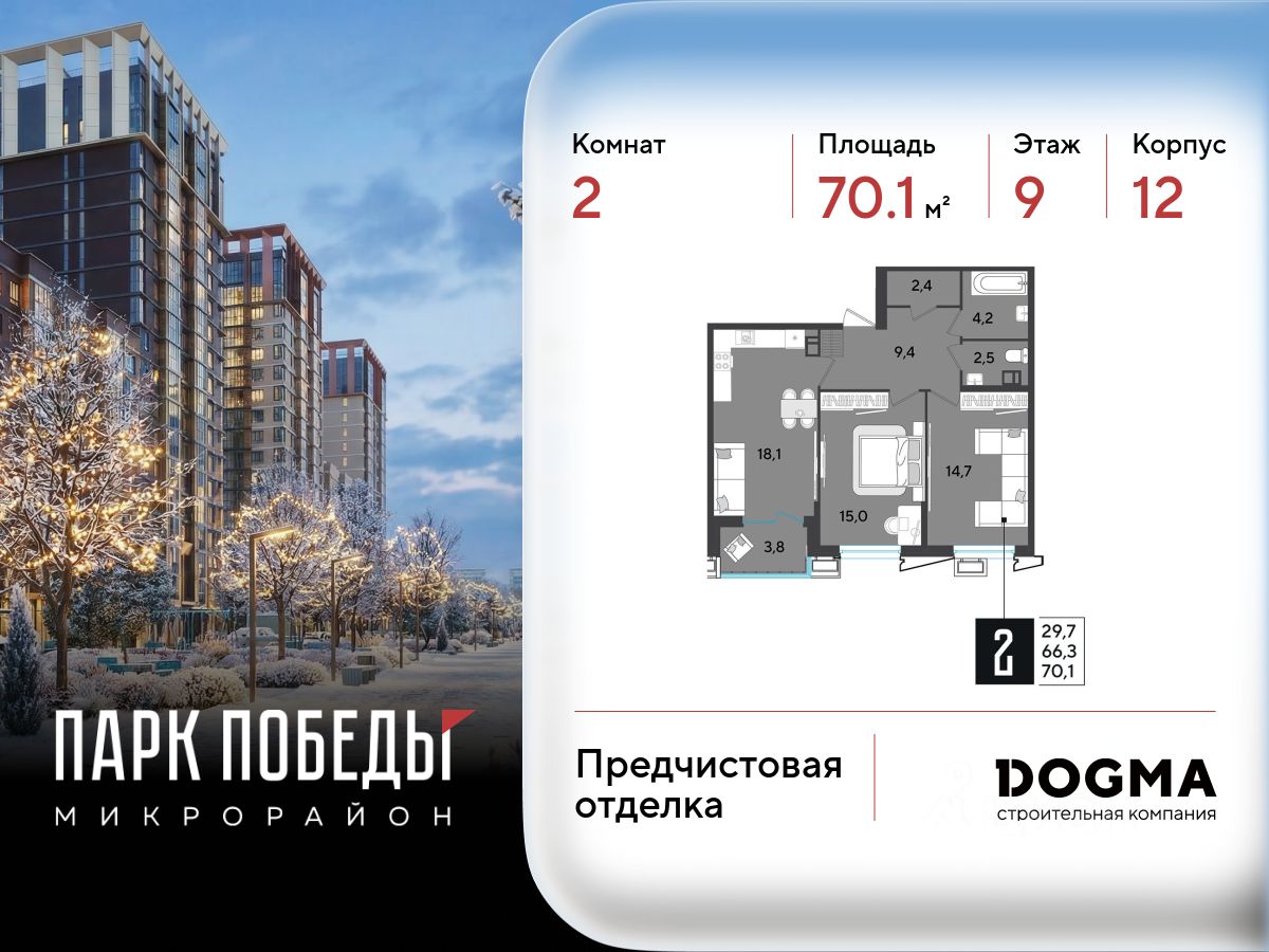 Срок сдачи: 2 кв. 2026, общей площадью 70.1 кв.м., на 9 этаже.