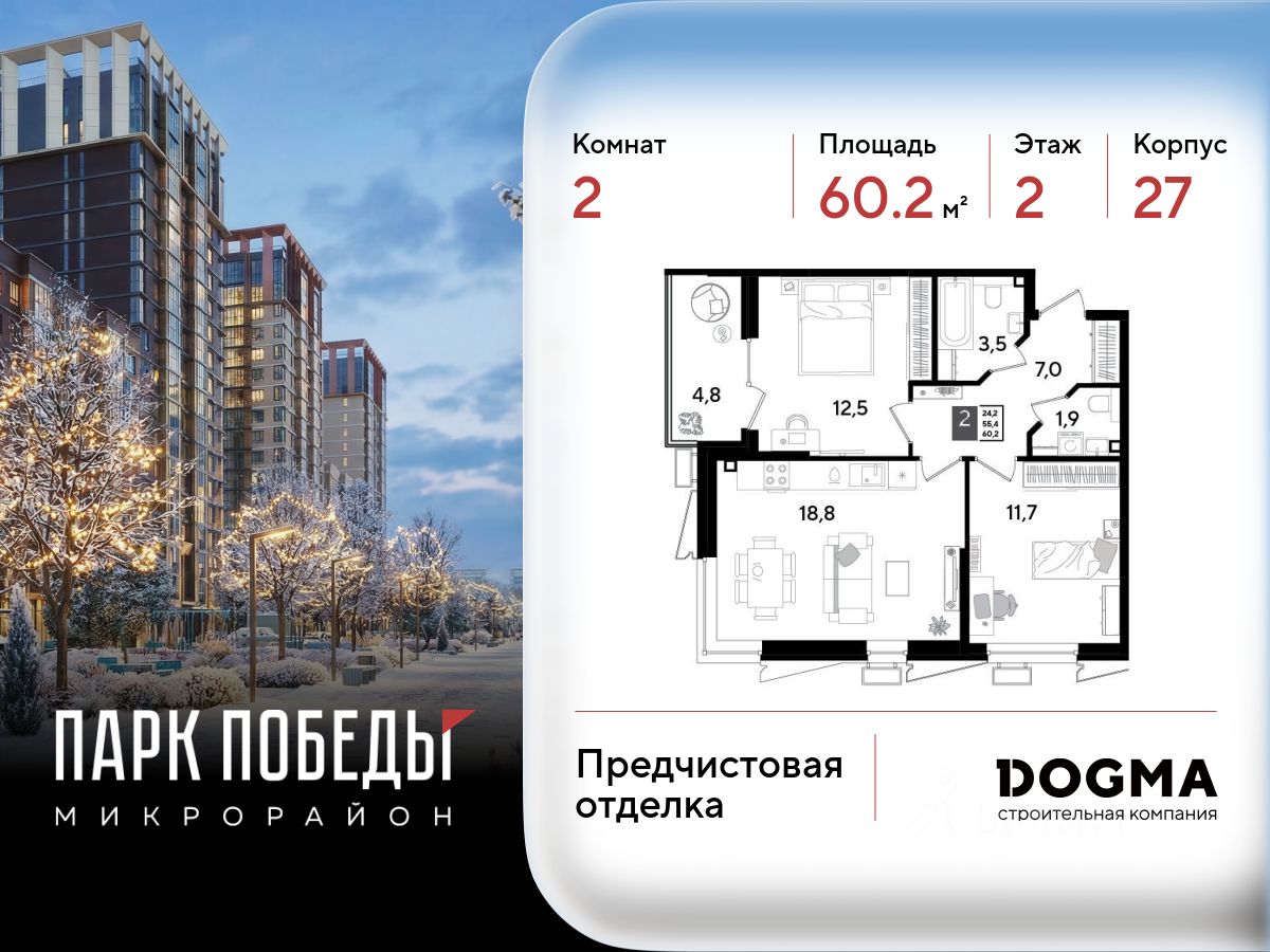 Срок сдачи: 2 кв. 2026, общей площадью 60.2 кв.м., на 2 этаже.