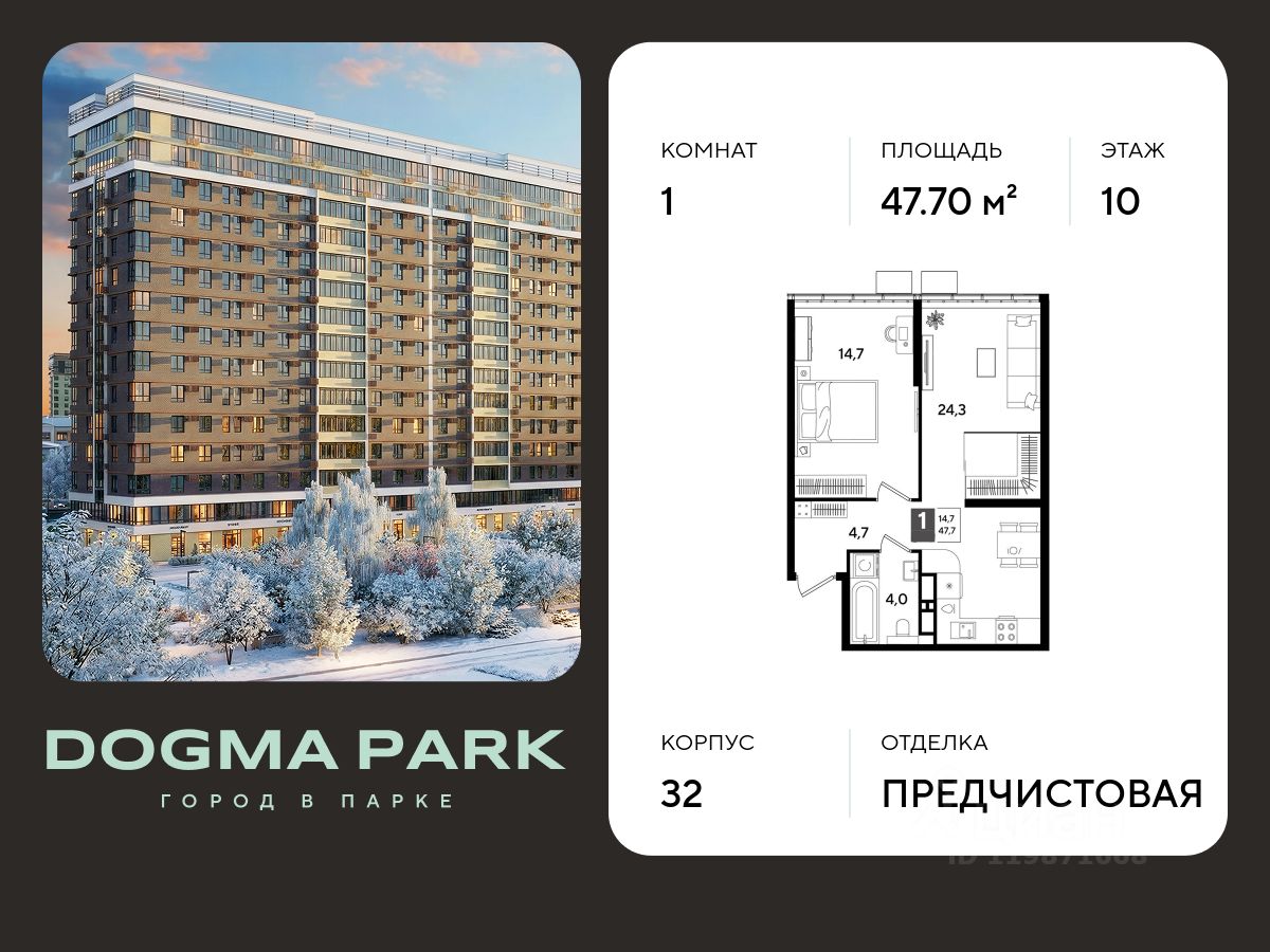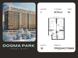 В продаже 1-комнатная квартира от застройщика! Мкр. "DOGMA PARK" г. Краснодар, Литер 32 Срок сдачи: 3 кв. 2027, общей площадью 47.7 кв.м., на 10 этаже.