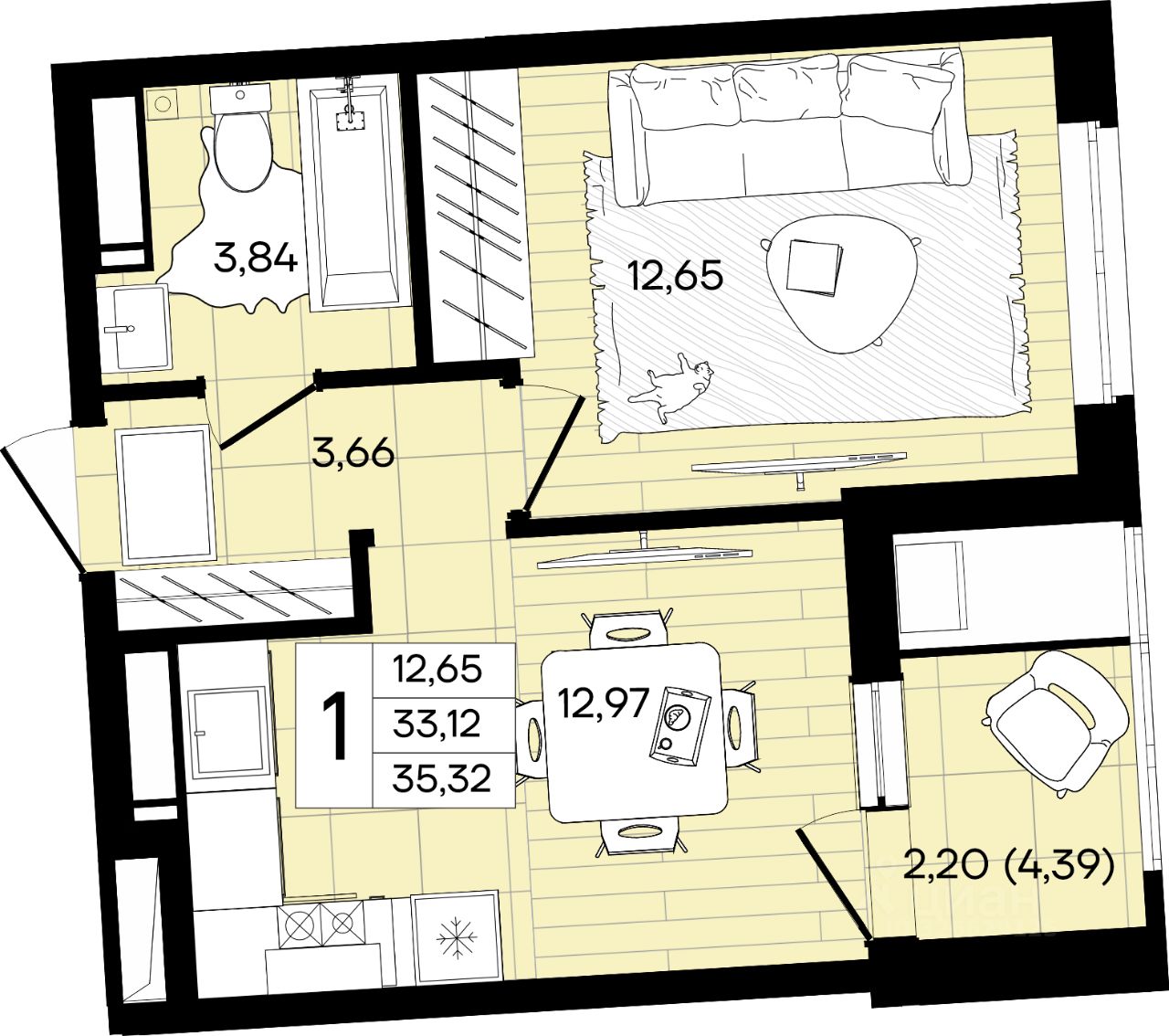 Высота потолков до 3,9 м наполняет пространство светом и воздухом, создавая ощущение свободы.