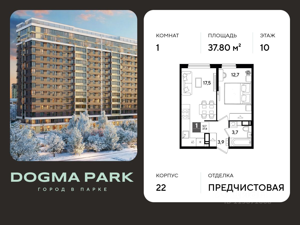 В продаже 1-комнатная квартира от застройщика! Мкр. "DOGMA PARK" г. Краснодар, Литер 22 Срок сдачи: 4 кв. 2027, общей площадью 37.8 кв.м., на 10 этаже.