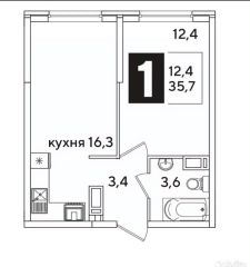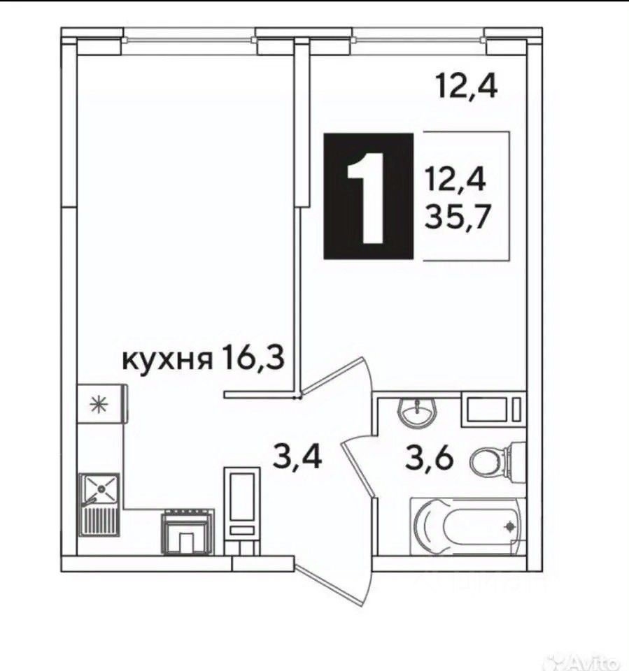 Плoщaдь квартиры 35,4 кв.м., куxня - 16,3 кв.м.
