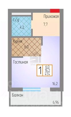 Планировка: кухня-гостиная зонирована от спальни, санузел (совмещённый), просторный коридор