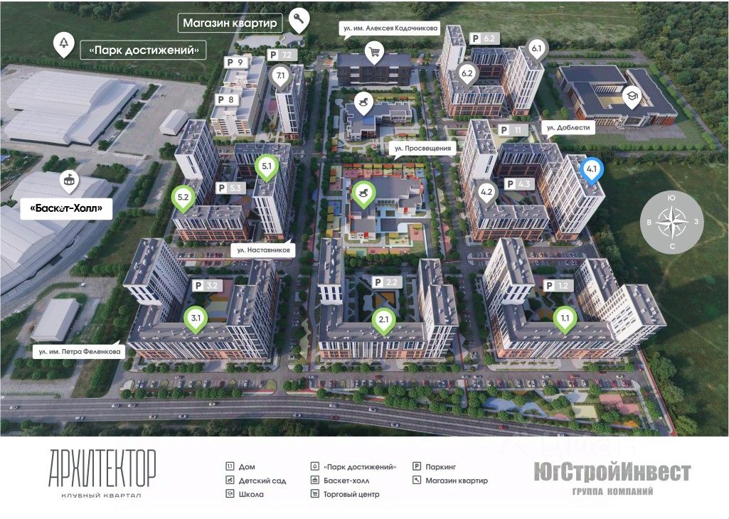 Клубный квартал "Архитектор" расположен в перспективном быстроразвивающемся районе города. В проекте жилого комплекса предусмотрено 10 домов разной этажности, два детских сада и школа. В каждом дворе расположена детская площадка, спроектированная совместно с психологами. Отдохнуть и провести время за разговорами с семьей и друзьями можно в различных дизайнерских лаунж-зонах. Безбарьерная среда, закрытые дворы, современное ландшафтное озеленение на территории клубного квартала способствуют комфортному пребыванию всех возрастов. В пешей доступности "Дворец водных видов спорта" и одна из главных спортивных арен города — "Баскет-Холл". Буквально 20 минут и Вы в центре города, еще 150 км — и Вас встречает побережье Краснодарского края.