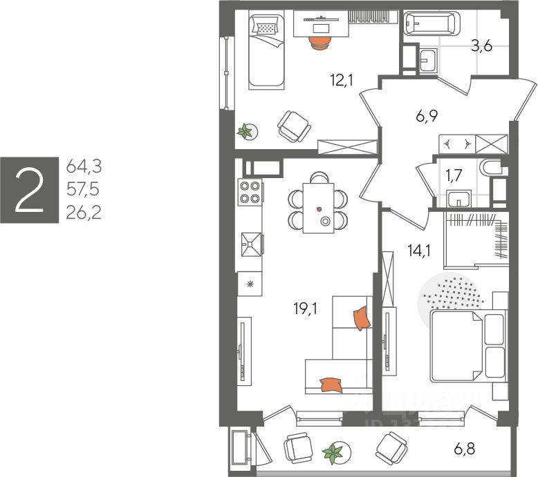 В продаже 2-комнатная квартира от застройщика! ЖК "Рекорд" 2 очередь, г. Краснодар, Литер 1 Срок сдачи: 4 кв. 2026, общей площадью 64.3 кв.м., на 24 этаже.