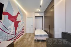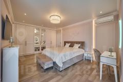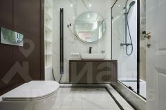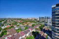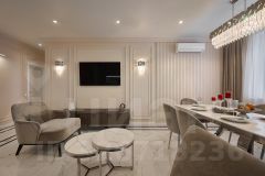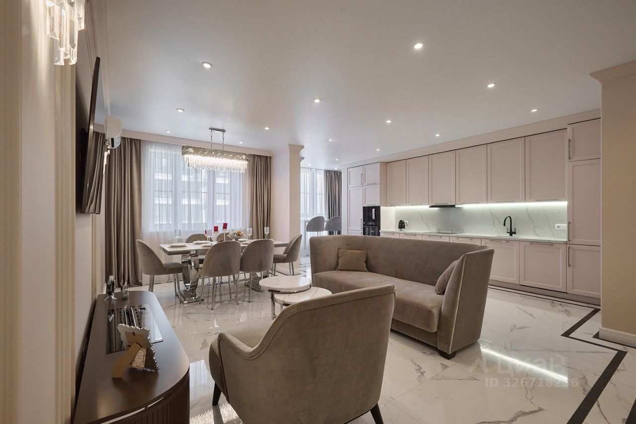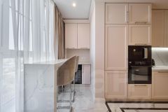 В квартире выполнен современный ремонт, теплые полы, фильтры очистки воды и измельчитель на раковине, отдельно постирочная комната, мебель делалась на заказ и везлась с Италии, техника SMEG, винный шкаф и барная стойка из натурального камня с роскошным видом на город.