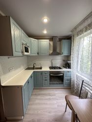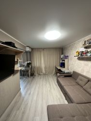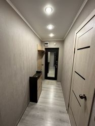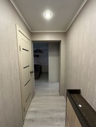 Натяжные потолки с точечным освещением, флезилиновые обои, ламинат 33 класса, санузел полностью в керамической плитке. Ремонт делали для себя.