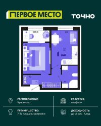 Жилой район "Первое место"- один из самых масштабных проектов в России. На территории 71 га 18 кварталов, 31 дом переменной этажности от 8 до 18 этажей, собственный парк 9 га, храмовый комплекс, пешеходный бульвар "Круг семьи", детские и спортивные площадки, мангальные зоны и различные локации для отдыха. В шаговой доступности действующие муниципальные образовательные учреждения: школа на 1 100 мест и детский сад на 250 мест. Помимо этого, в жилом районе "Первое место" построятся школа на 1700 мест с крытым 25-метровым бассейном и 5 детских садов на 1 490 мест. На первых этажах многоуровневых парковок "паркхабов" разместится более 61 тыс м2 коммерческих помещений. Жителям будут доступны собственный фитнес-центр, кафе, рестораны и магазины. В каждом подъезде предусмотрены дизайнерские холлы в стиле лобби отелей, консьерж-сервис, лапомойки, отдельные колясочные и велосипедные. Также в домах будут просторные кладовые помещения и комнаты для хранения почты с почтоматами для получения посылок из маркетплейсов.