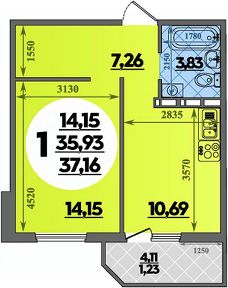 Продаётся 1-комнатная квартира в строящемся доме (Литер 2), срок сдачи: III-кв. 2027, общей площадью 37.16 кв.м., на 1 этаже.
