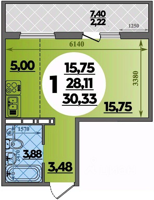 Продаётся студия в строящемся доме (Литер 2), срок сдачи: III-кв. 2027, общей площадью 30.33 кв.м., на 1 этаже.
