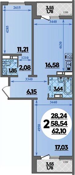 Продаётся 2-комнатная квартира в строящемся доме (Литер 2), срок сдачи: III-кв. 2027, общей площадью 62.1 кв.м., на 1 этаже.