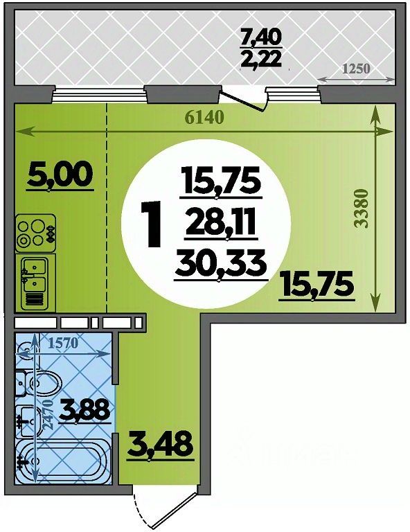 Продаётся студия в строящемся доме (Литер 2), срок сдачи: III-кв. 2027, общей площадью 30.33 кв.м., на 4 этаже.
