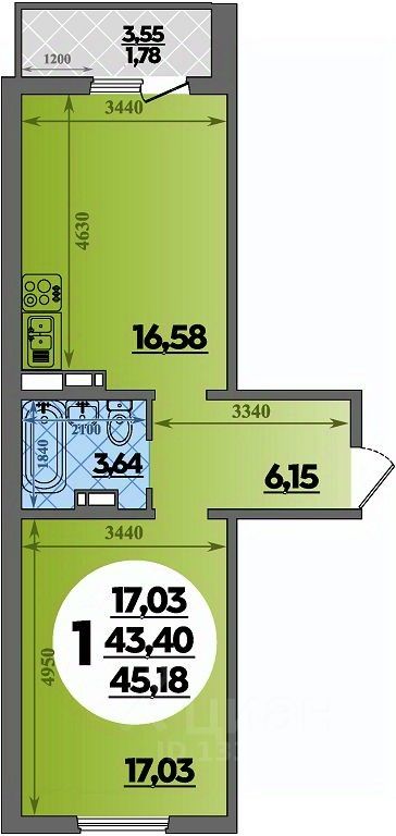 Продаётся 1-комнатная квартира в строящемся доме (Литер 2), срок сдачи: III-кв. 2027, общей площадью 45.18 кв.м., на 9 этаже.