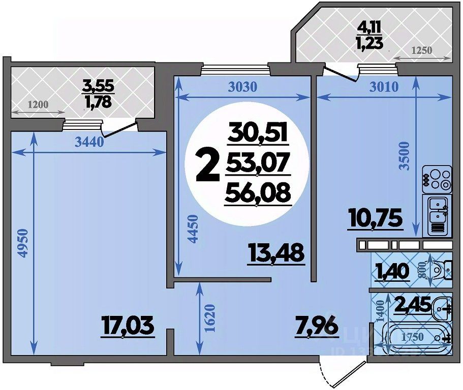 Продаётся 2-комнатная квартира в строящемся доме (Литер 2), срок сдачи: III-кв. 2027, общей площадью 56.08 кв.м., на 1 этаже.