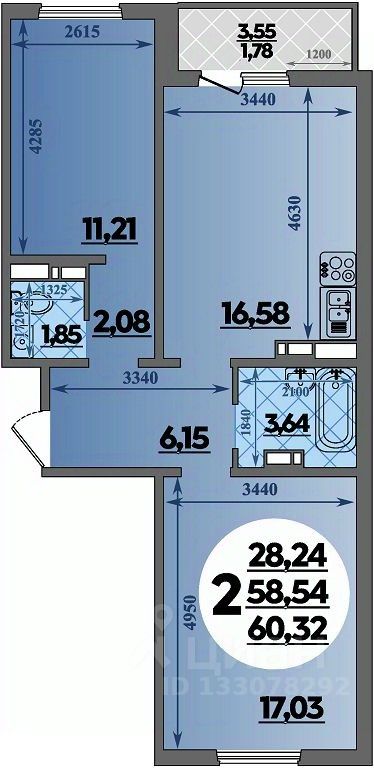 Продаётся 2-комнатная квартира в строящемся доме (Литер 2), срок сдачи: III-кв. 2027, общей площадью 60.32 кв.м., на 1 этаже.