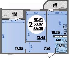 Продаётся 2-комнатная квартира в строящемся доме (Литер 2), срок сдачи: III-кв. 2027, общей площадью 56.08 кв.м., на 3 этаже.