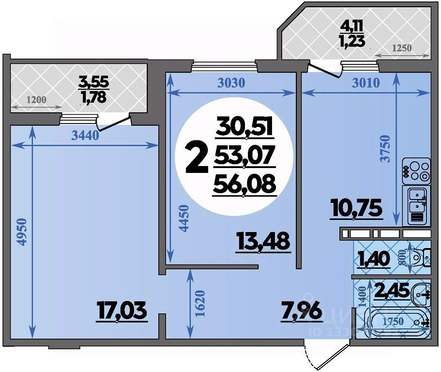 Продаётся 2-комнатная квартира в строящемся доме (Литер 2), срок сдачи: III-кв. 2027, общей площадью 56.08 кв.м., на 5 этаже.
