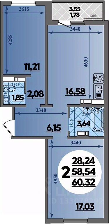 Продаётся 2-комнатная квартира в строящемся доме (Литер 2), срок сдачи: III-кв. 2027, общей площадью 60.32 кв.м., на 8 этаже.