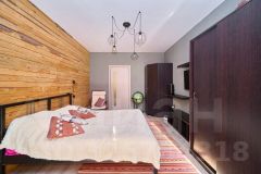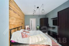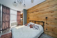 Главная спальня впечатляет витражными окнами, а одна из стен обшита натуральным деревом, что придает интерьеру уникальный характер. Освещение и розетки оформлены в стиле лофт. При желании вы можете зонировать пространство с помощью ширмы для создания уютного рабочей зоны с компьютером. Вторая спальня детская, выполненная в спокойных тонах.