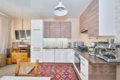Большая кухня оборудована всей необходимой техникой: встроенным холодильником, посудомойкой, духовым шкафом, варочной плитой и вытяжкой, а также микроволновой печью. Подсветка рабочей зоны создает атмосферу уюта и уюта.