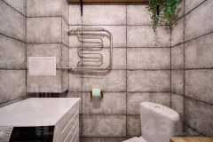 Ванная комната также оформлена в стиле лофт с серыми оттенками и деревянными полками. Раковина установлена на деревянном подстолье, аккуратно скрывающем корзину для белья. Чугунная ванна позволяет долго сохранять тепло воды.