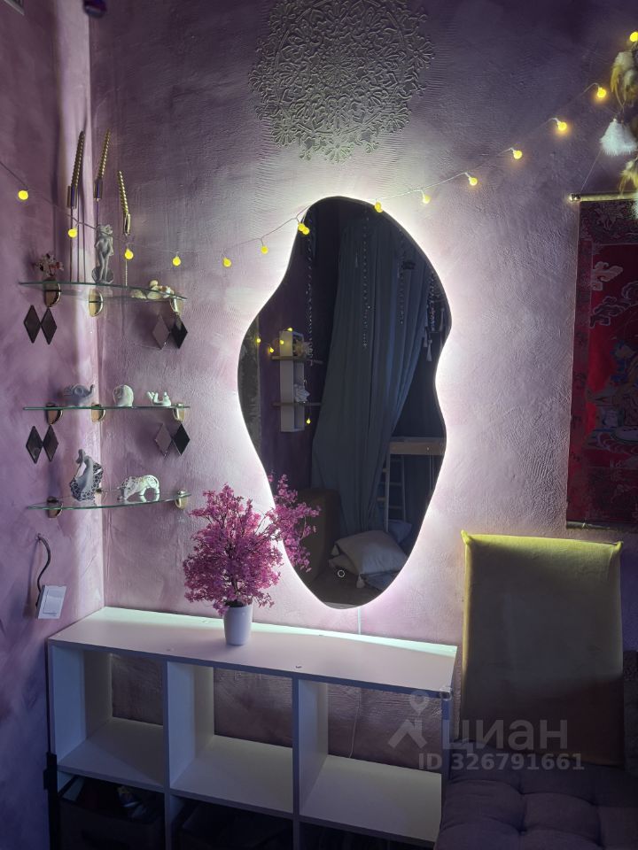 В этой комнате есть кондиционер. Полочки на стенах, зеркало, золотые мандалы.