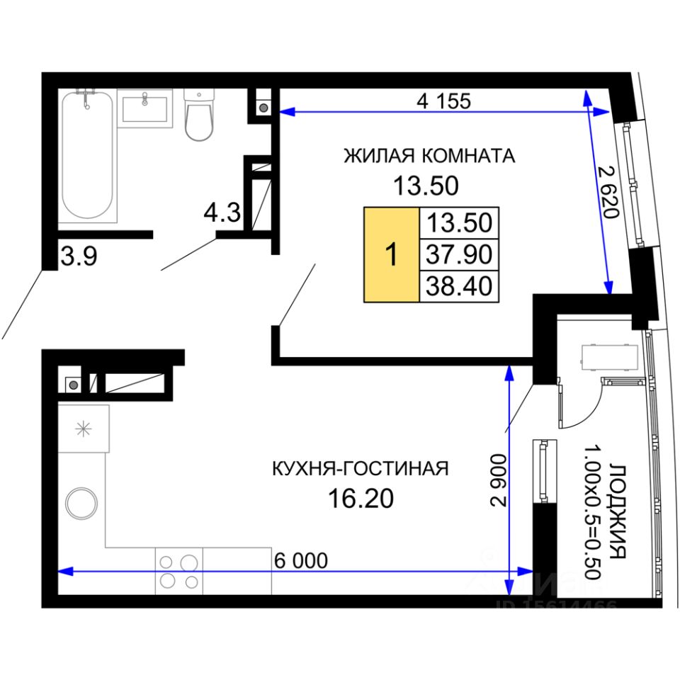 Общая площадь38,4 м²
