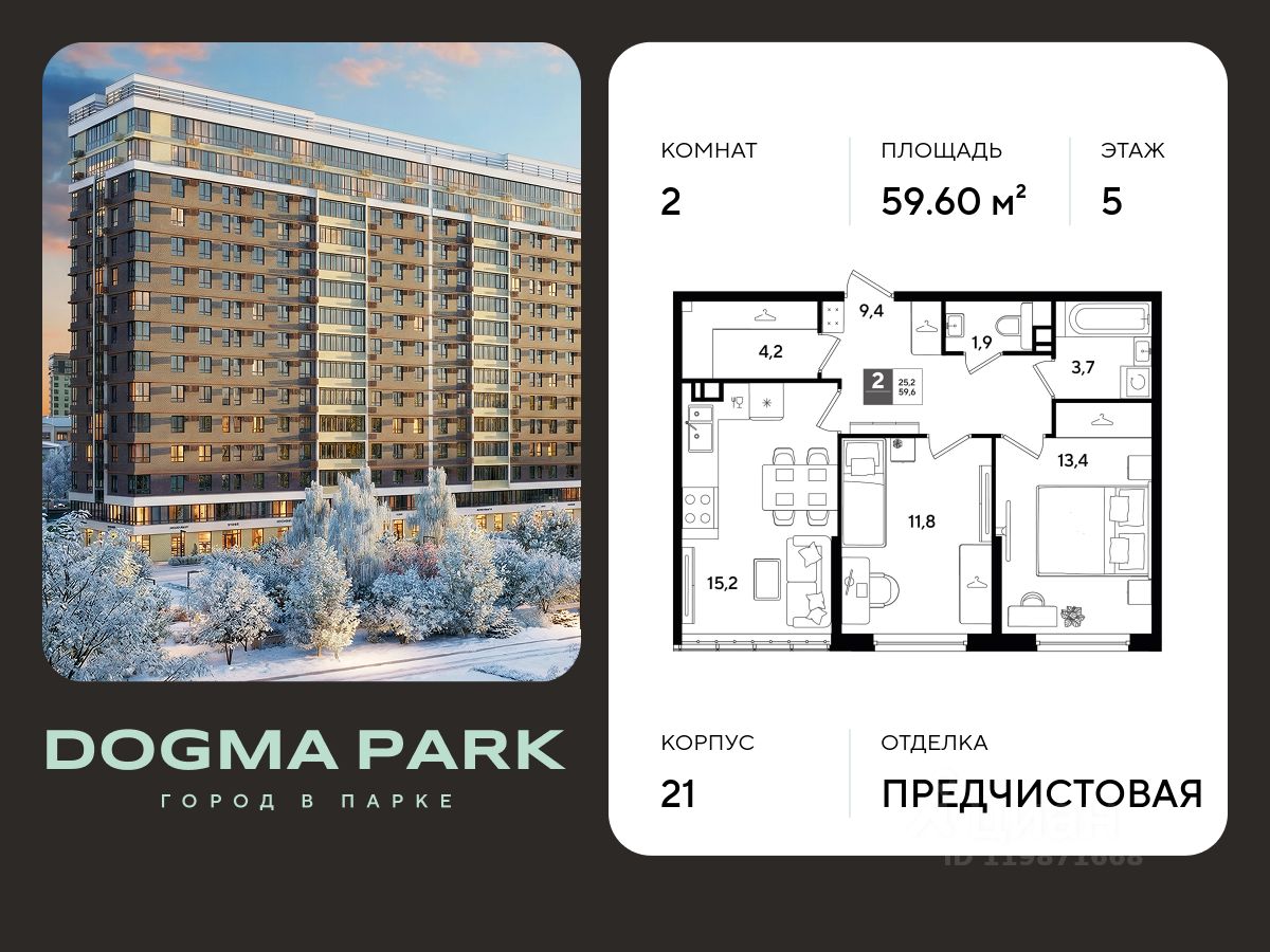 В продаже 2-комнатная квартира от застройщика! Мкр. "ДОГМА ПАРК" г. Краснодар, Литер 16 Срок сдачи: 2 кв. 2027, общей площадью 59.60 кв.м., на 5 этаже.