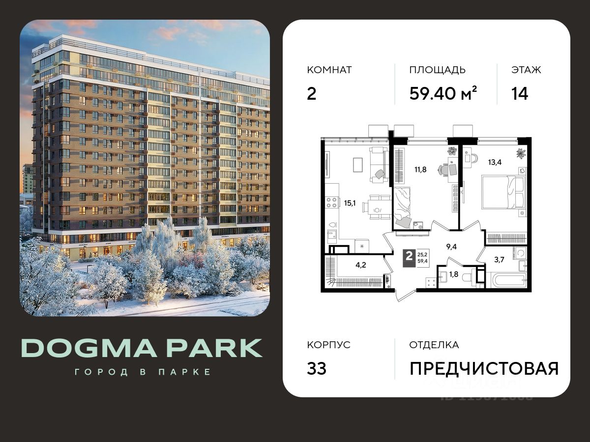 В продаже 2-комнатная квартира от застройщика! Мкр. "ДОГМА ПАРК" г. Краснодар, Литер 33 Срок сдачи: 2 кв. 2027, общей площадью 59.40 кв.м., на 14 этаже.