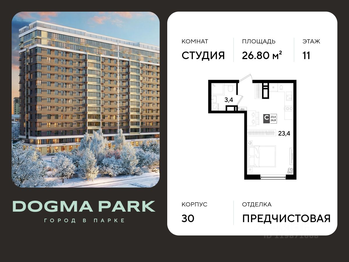 В продаже квартира-студия от застройщика! Мкр. "ДОГМА ПАРК" г. Краснодар, Литер 30 Срок сдачи: 2 кв. 2027, общей площадью 26.80 кв.м., на 11 этаже.