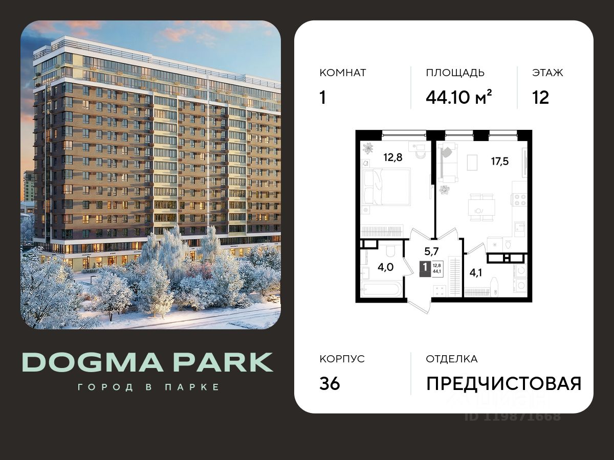 В продаже 1-комнатная квартира от застройщика! Мкр. "ДОГМА ПАРК" г. Краснодар, Литер 36 Срок сдачи: 2 кв. 2027, общей площадью 44.10 кв.м., на 12 этаже.