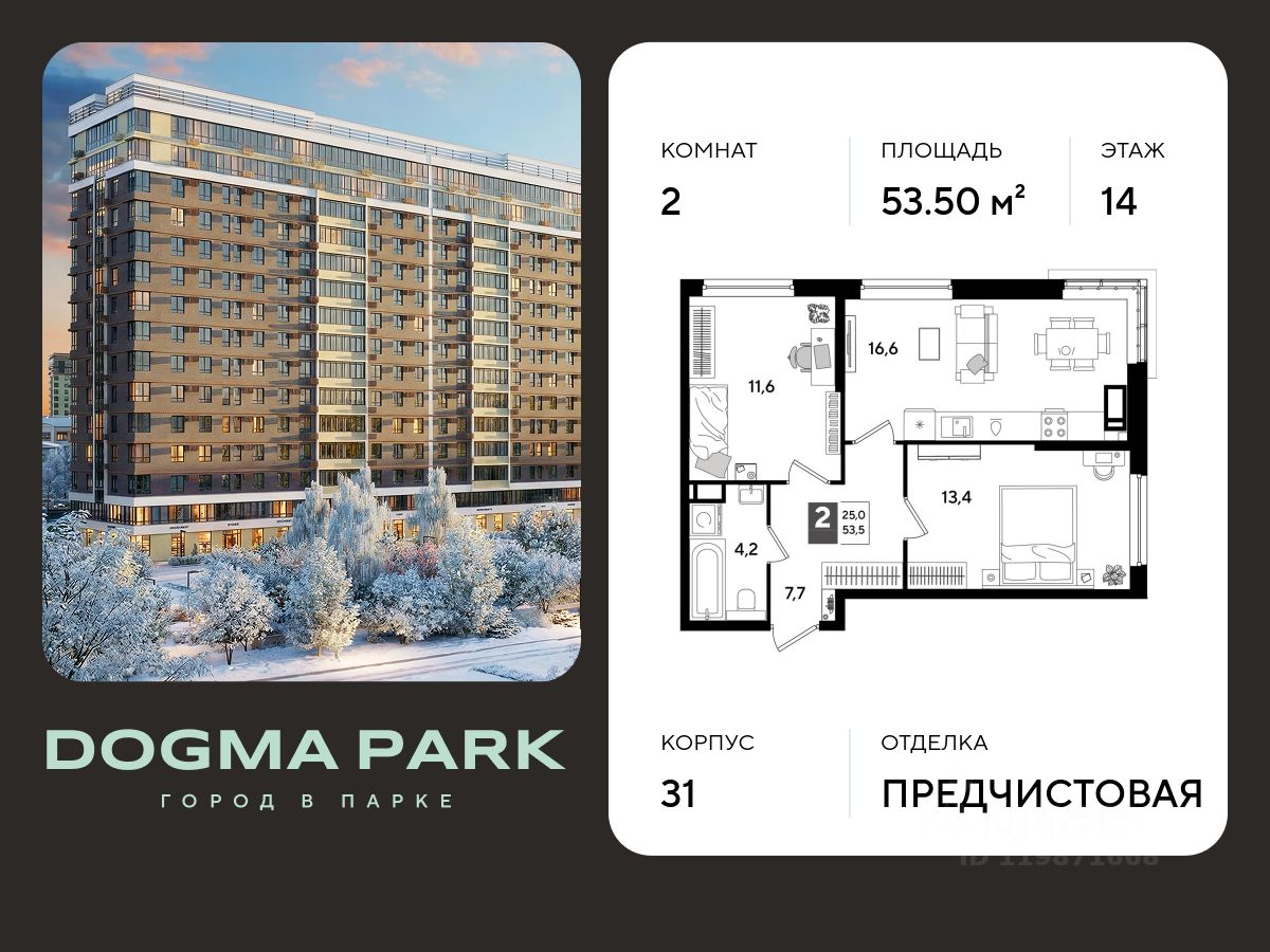 В продаже 2-комнатная квартира от застройщика! Мкр. "ДОГМА ПАРК" г. Краснодар, Литер 36 Срок сдачи: 2 кв. 2027, общей площадью 53.50 кв.м., на 14 этаже.