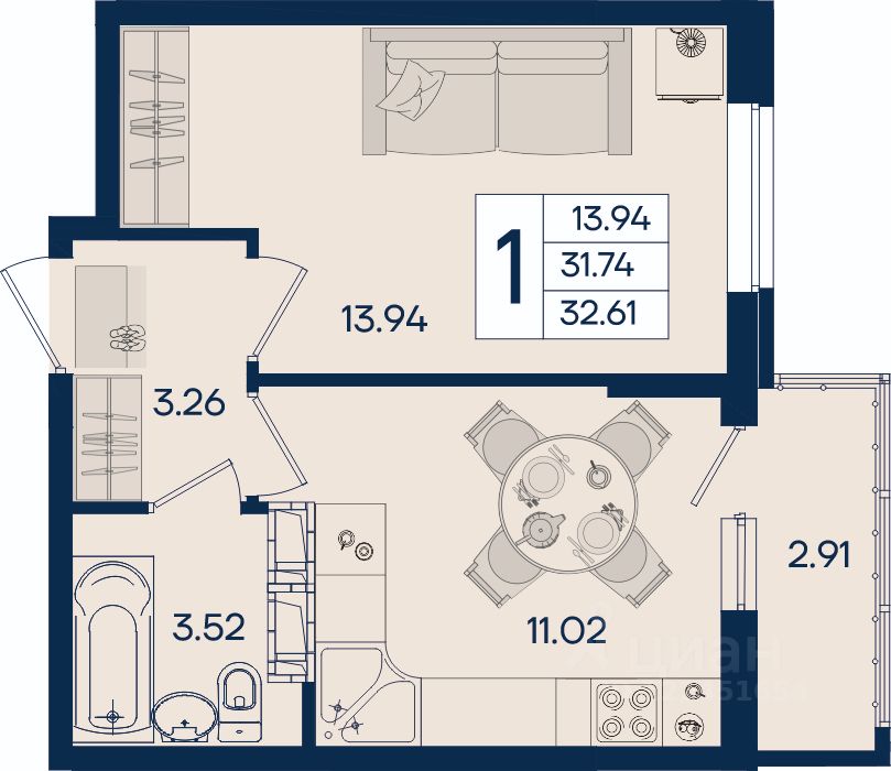 1 комнатная квартира 32.61 м² с ремонтом, на 8 этаже в жилом комплексе "Дом 101".