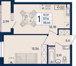 1 комнатная квартира 38.66 м² с ремонтом, на 13 этаже в жилом комплексе "Дом 101".