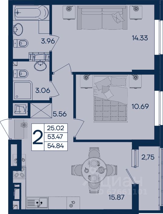 2 комнатная квартира 34.89 м² с ремонтом, на 4 этаже в жилом комплексе "Дом 101".