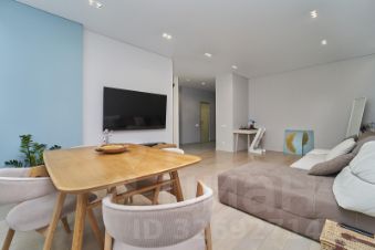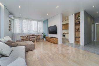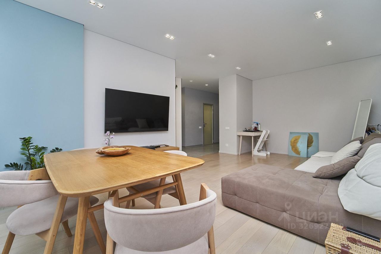 При входе в квартиру открывается просторный холл, который ведет в светлую и воздушную гостиную. Гостиная с большими окнами оформлена в современном стиле с использованием качественных материалов. Мягкая мебель, современное освещение и декоративные элементы создают уютную и приглашающую атмосферу.