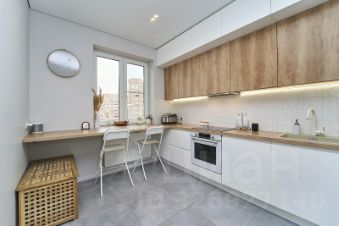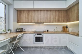 Кухня выполнена в современном дизайне с интегрированной бытовой техникой высокого класса, включая посудомоечную машину, встроенный холодильник и духовой шкаф.