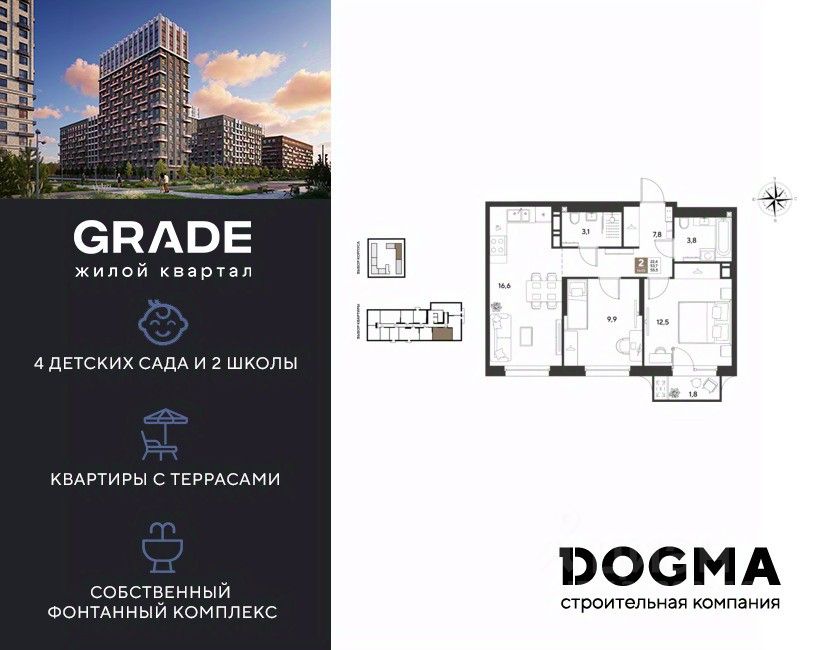 Квартал с переменной этажностью 9, 16 и 18 этажей предлагает полную инфраструктуру для жизни: 4 детских сада, 2 школы, поликлиника и ФОК расположены в шаговой доступности.