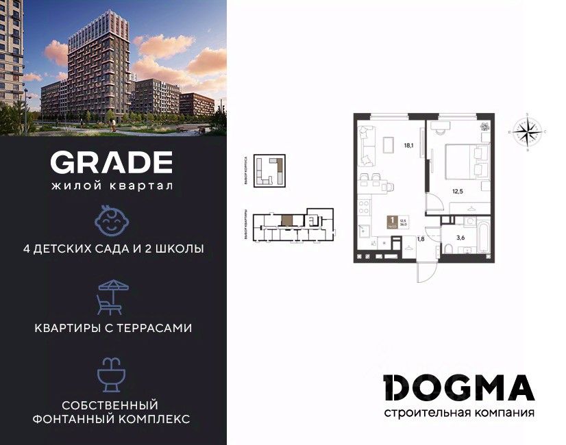 Квартал с переменной этажностью 9, 16 и 18 этажей предлагает полную инфраструктуру для жизни: 4 детских сада, 2 школы, поликлиника и ФОК расположены в шаговой доступности.
