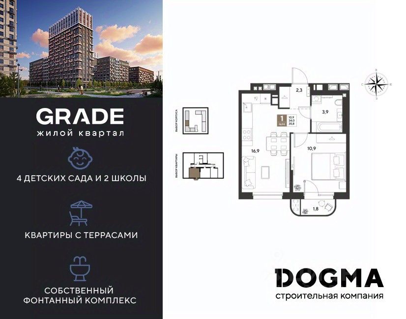 Квартал с переменной этажностью 9, 16 и 18 этажей предлагает полную инфраструктуру для жизни: 4 детских сада, 2 школы, поликлиника и ФОК расположены в шаговой доступности.