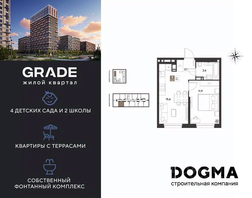 Квартал с переменной этажностью 9, 16 и 18 этажей предлагает полную инфраструктуру для жизни: 4 детских сада, 2 школы, поликлиника и ФОК расположены в шаговой доступности.