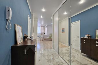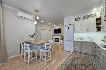 В квартире две просторные спальни с встроенными гардеробными и большая кухня-гостиная — идеальное пространство для семейных вечеров и личного комфорта. Качественный ремонт, выполненный с вниманием к деталям, сочетает стиль и функциональность: встроенные шкафы в прихожей, умная система защиты от протечек с быстрым отключением воды, скрытый проточный водонагреватель — забота о безопасности и удобстве на каждый день. Кухонный гарнитур с акриловой каменной столешницей и всей необходимой техникой — готовность к вашим кулинарным экспериментам с комфортом. В гостиной — электрический камин, создающий уют и дополнительное тепло.