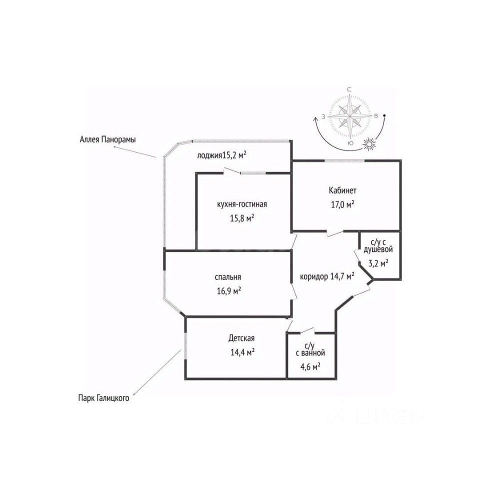 До парка Галицкого около пяти минут пешком, а знаменитый стадион виден с лоджии.