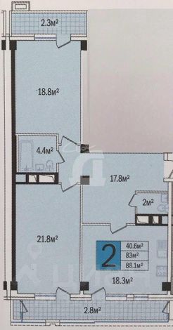 - площадь кухни-гостиной 19 кв.м. и спальни 22 кв.м. с выходом на просторную лоджию, площадь ещё одной спальни 19 кв.м. с выходом на лоджию